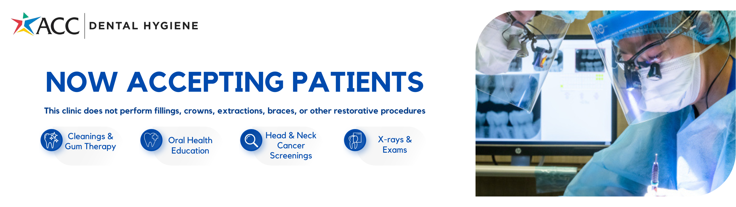 ACC’s Dental Hygiene Clinic does not perform fillings, crowns, extractions, braces, or other restorative procedures.