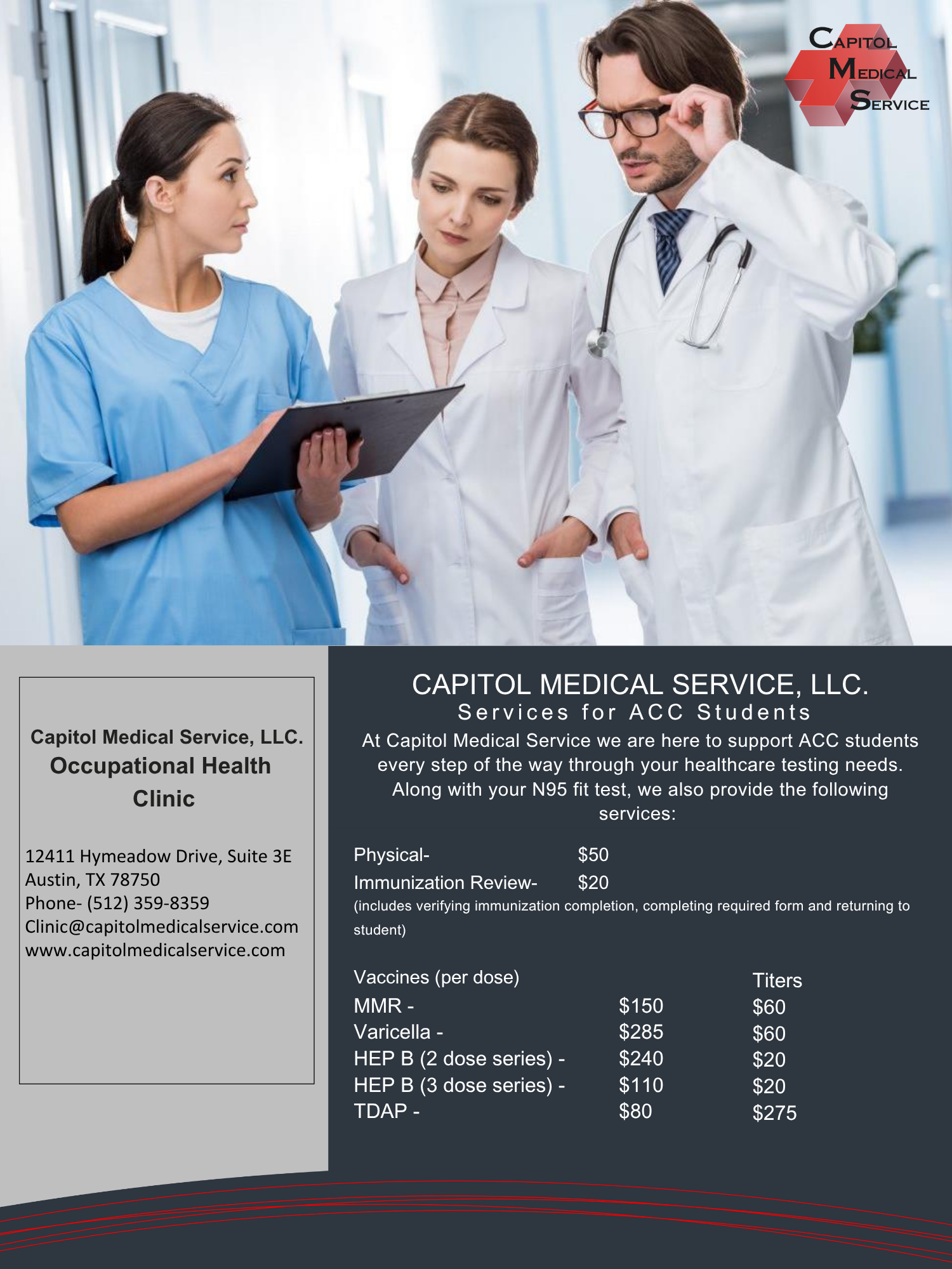 Health Sciences students must comply with both Texas law and clinical facility requirements related to immunization and testing. Students should not delay completing their immunizations; some take up to 4-6 months to complete.