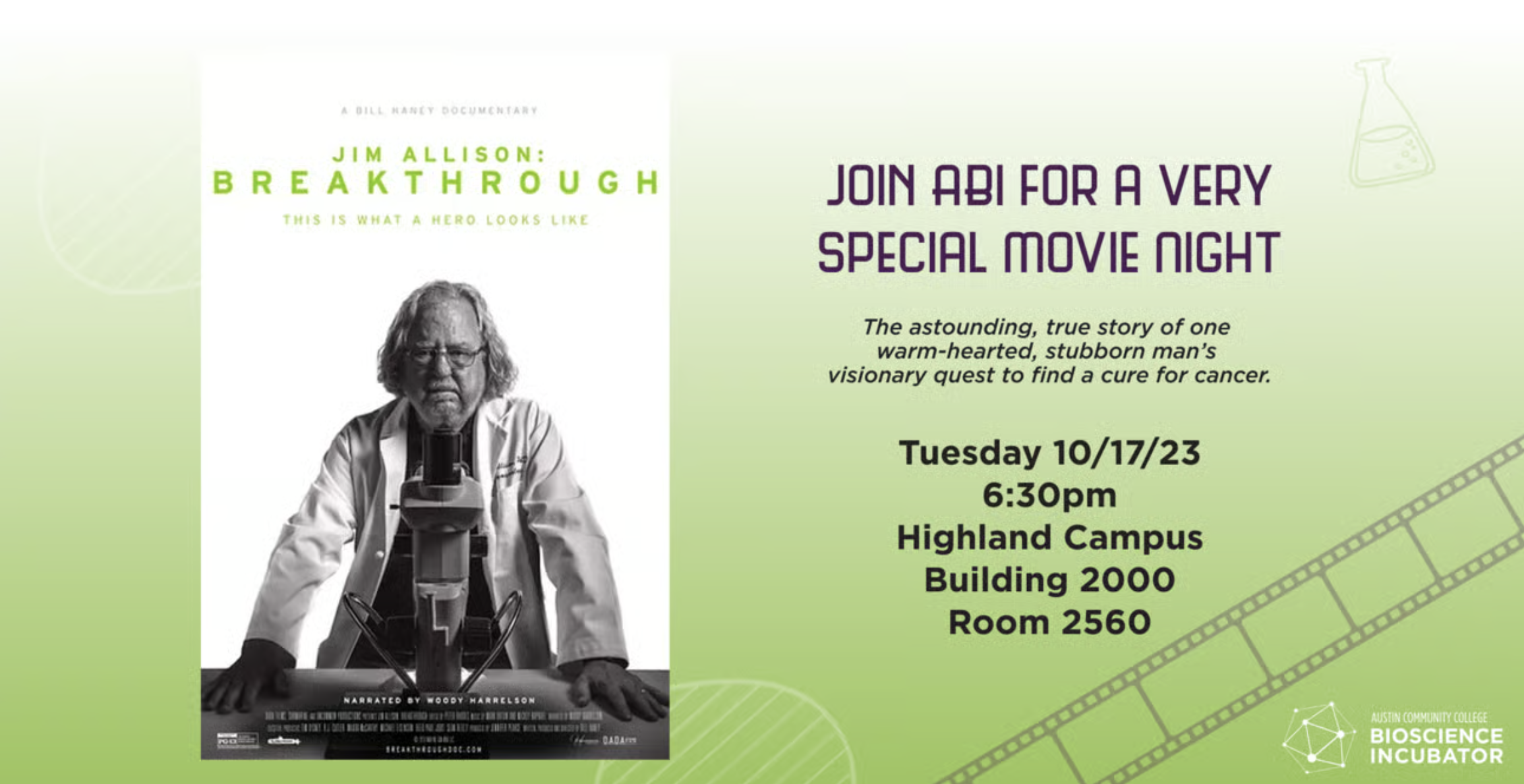 Upcoming EventJoin ACC's Bioscience Incubator for a very special movie night screening the award-winning documentary Jim Allison: BreakthroughTuesday 10/17/23 @ 6:30pmHighland Campus: Building 2000, Room 2560Reserve Your SpotThe Austin Community College Bioscience...
