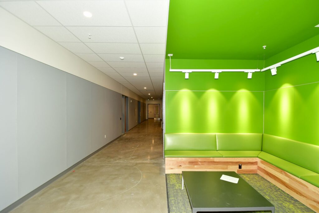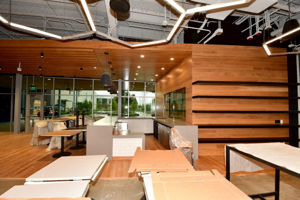 The Black Box Theatre wood floor is being installed. The wood stage flooring in the Music Performance Hall will be installed soon. The fixed seating in the performance spaces is being installed. Final touches and last-minute finishes are being completed. The mechanical and electrical systems have had a final inspection. The plumbing and fire alarm systems are being tested and will be inspected soon. The majority of the furniture has been installed and equipment installation is well underway. The exterior furniture has been installed as well.