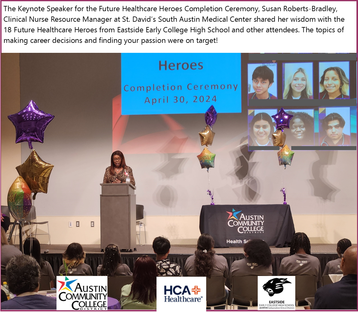 More than 75 people attended to congratulate the students’ success and perseverance. Susan Roberts-Bradley, Clinical Nurse Resource Manager at St. David’s South Austin Medical Center, served as the keynote speaker.